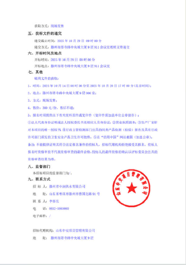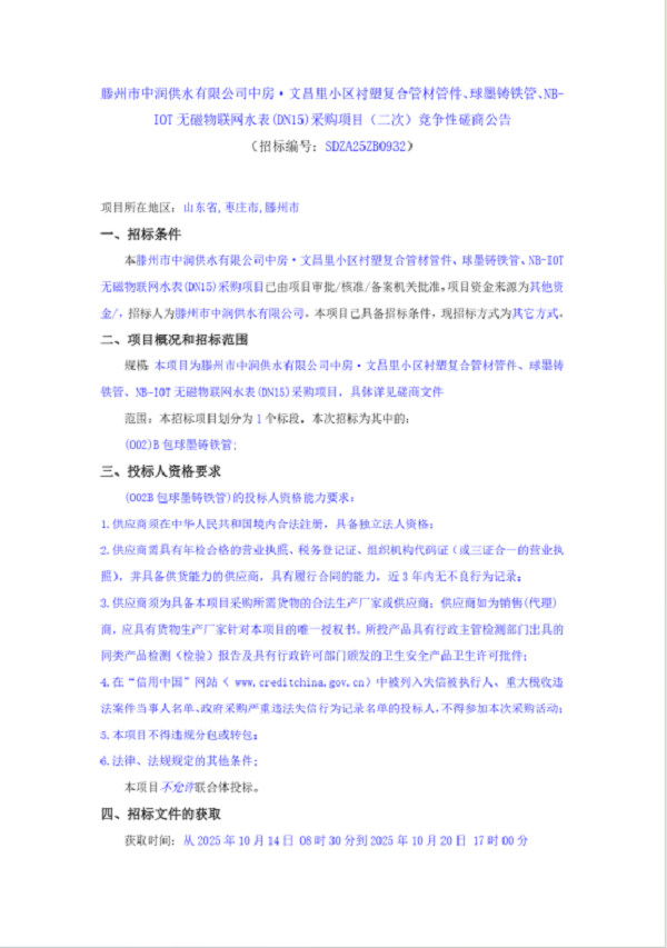 滕州市中潤供水有限公司中房·文昌里小區(qū)襯塑復(fù)合管材管件、球墨鑄鐵管、NB-IOT 無磁物聯(lián)網(wǎng)水表(DN15)采購項目(二次)競爭性磋商公告