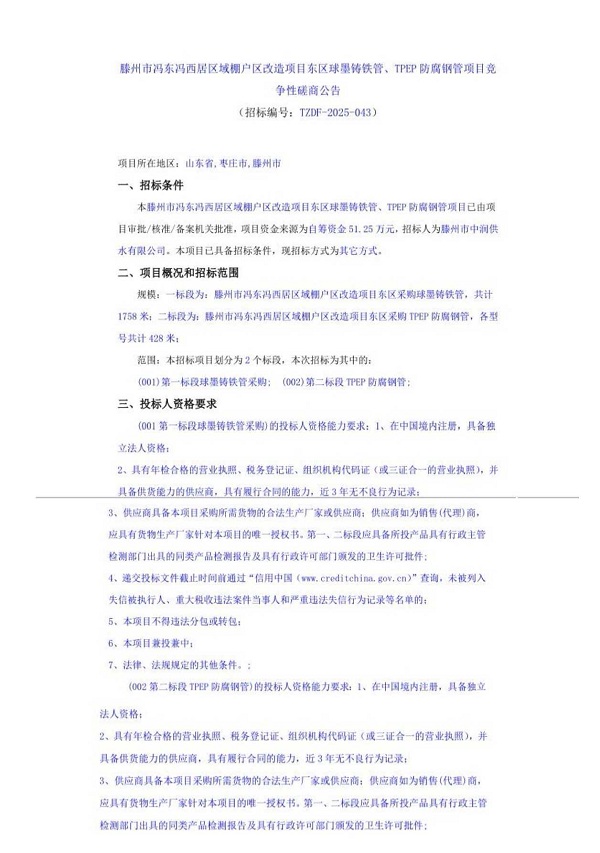 滕州市馮東馮西居區(qū)域棚戶區(qū)改造項目東區(qū)球墨鑄鐵管、TPEP防腐鋼管項目競爭性磋商公告
