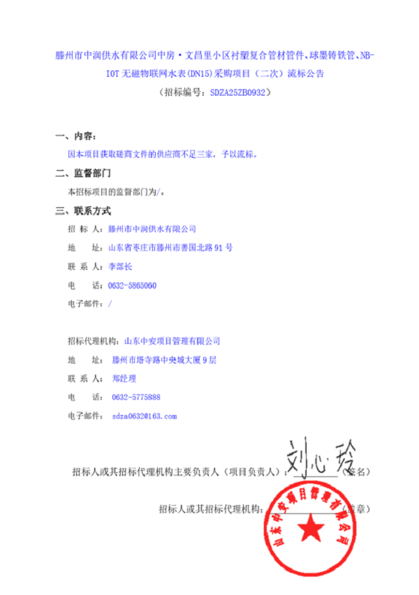 滕州市中潤供水有限公司中房·文昌里小區(qū)襯塑復(fù)合管材管件、球墨鑄鐵管、NB-IOT 無磁物聯(lián)網(wǎng)水表(DN15)采購項目(二次)流標公告